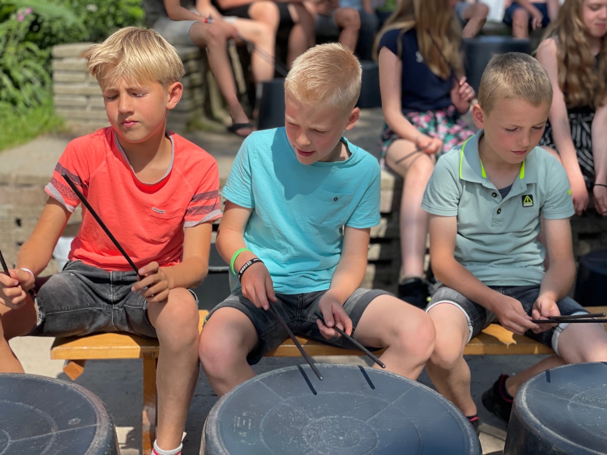 Juf Marije, geschoold aan het conservatorium, geeft wekelijkse muziekles aan alle groepen. |