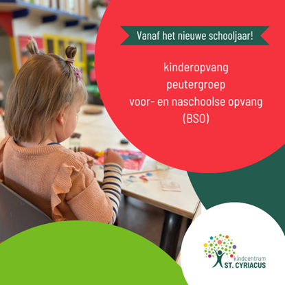 Vanaf het nieuwe schooljaar (augustus 2025) start er kinderopvang, een peutergroep en voor- en naschoolse opvang (BSO) op St. Cyriacus. Daar zijn we heel blij mee! Kinderen kunnen zich straks van baby tot puber (0 - 13) in de veilige en vertrouwde omgeving van St. Cyriacus ontwikkelen.