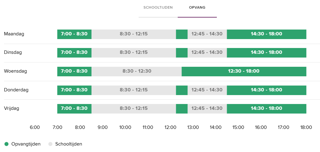 We streven er naar om van maandag t/m vrijdag opvang te bieden van 07.00 tot 18.00 uur. Tussenschoolse opvang (12.15-12.45 uur) is gratis en wordt gergeld door het team.